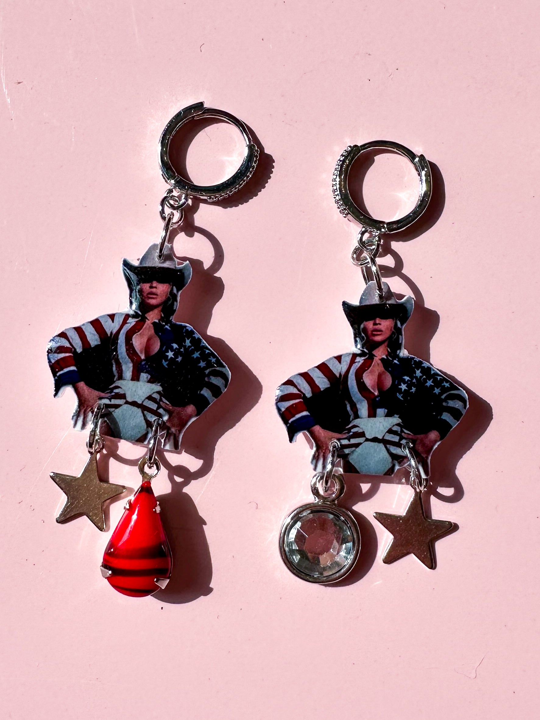 Serving full cowgirl energy, these bold Bey Haw Huggies mix western iconography with glam accents. Featuring custom Pop Charms, rhinestones, stars, and fiery red drops, they’re the ultimate ode to country-meets-pop stardom — a little yeehaw, a little diva.