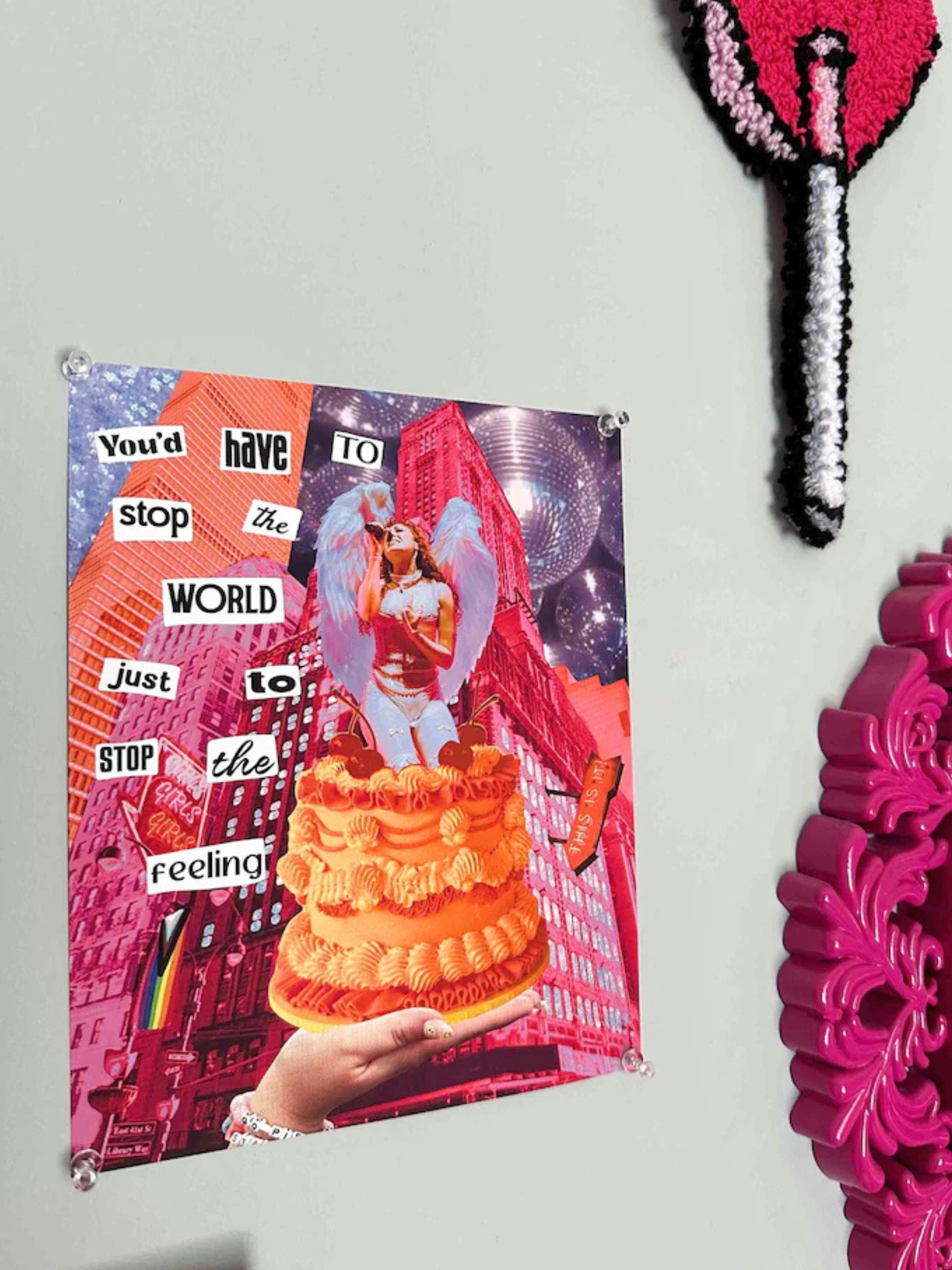 Chappell Collage Print, featuring lyrics “You’d have to stop the world just to stop the feeling” and with a lesbian pride flag inspired color palette.