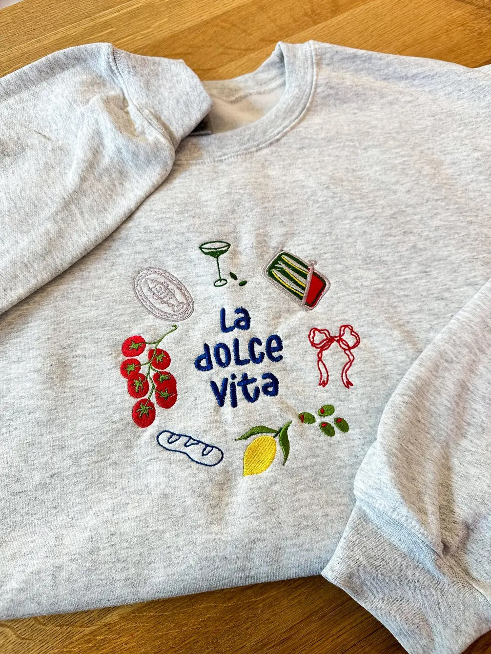 Embroidered design made on a Gildan crewneck in the color Ash Grey