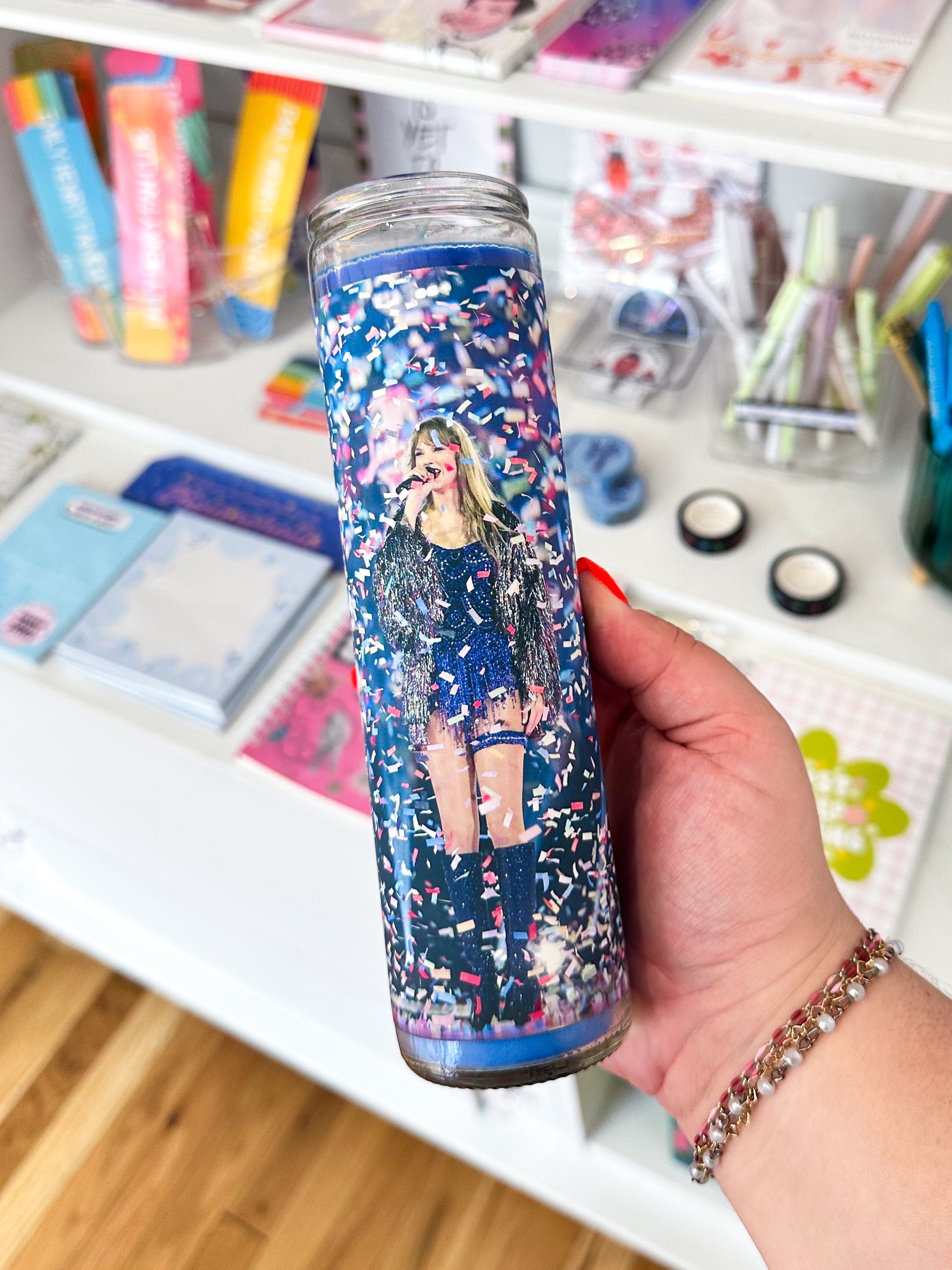 Light up your space with the Tour Confetti Candle! Bursting with vibrant colors and a fun, festive vibe, this candle brings the excitement of the tour right to your room. Perfect for fans who want to celebrate every era with a playful pop of confetti-inspired charm. Let the scent and sparkle set the mood for your next sing-along or dance party!
