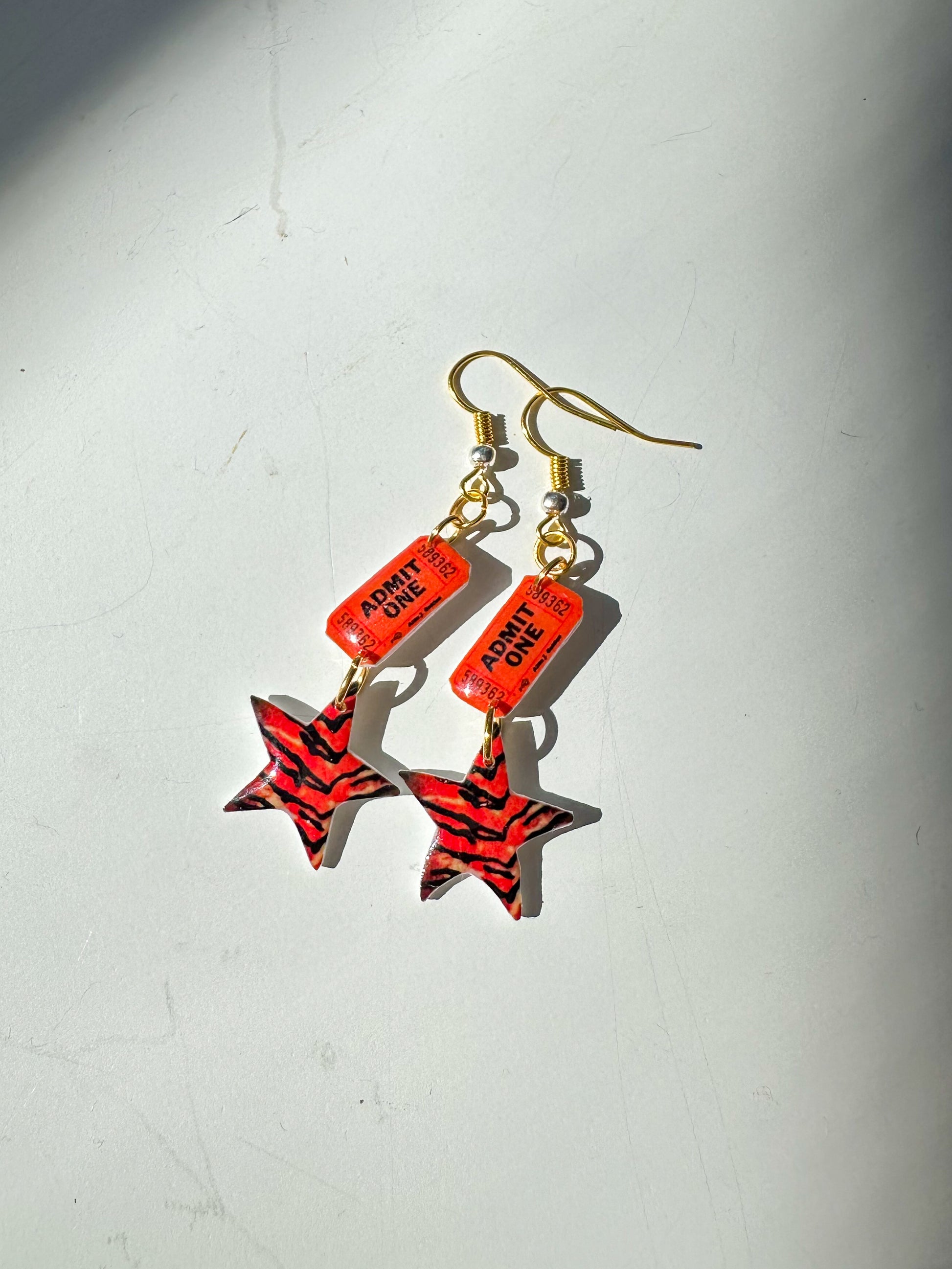 The Ticket To The Jungle earrings are a sparkly statement pair built with Pop Charms styled like faux tickets, accented with dangling crystals and mixed hardware. Every detail is sourced with care, blending new and vintage components for a piece that feels special and game-day ready.